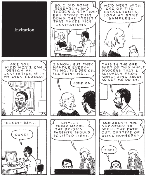 com o qual narra (e de certa forma desmonta) os preparativos para o seu casamento iminente, numa série de curtos episódios, directos e incisivos. Com os quais ilustra bem, por vezes mesmo de forma incómoda, o grande negócio que é hoje a organização de (qualquer) casamento, onde não podem faltar convites, fotógrafos e cameramen, refeições de arromba, bailaricos, fogo de artificio, DJs e sabe-se lá que mais, transformando num autêntico arraial impessoal aquilo que na origem deveria ser um momento significativo e marcante da vida de um casal.Se Tomine mantém o seu traço habitual, que funciona perfeitamente apesar do reduzido tamanho das páginas, não deixam de ser curiosos dois piscares de olhos a dois clássicos dos quadradinhos americanos: F